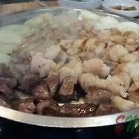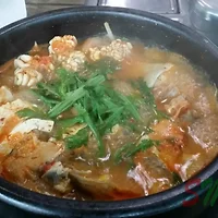해물들을 먹기 좋게 자른 후 열심히 먹어주면 되는데요. 확실히 매운 맛을 일품이 거 같아요. 뭐랄까 매워서 혀가 조금 괴롭지만, 자꾸 먹고 싶은 그런 맛 있잖아요. 홍합, 꽃게, 떡, 오징어 위에 새우를 하나 올려봤습니다. 군침이 도시나요. 이마에 땀이 맺히고, 손은 더 빨라집니다.