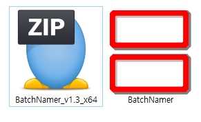 BatchNamer 프로그램을 윈도우 버전에 맞게 다운로드 받으신 후 압축을 풀면, 아래와 같은 빨간 직사각형 두개 형상을 한 프로그램이 생깁니다. 클릭을 해보시면 별도의 설치과정 없이 바로 프로그램이 실행됩니다.