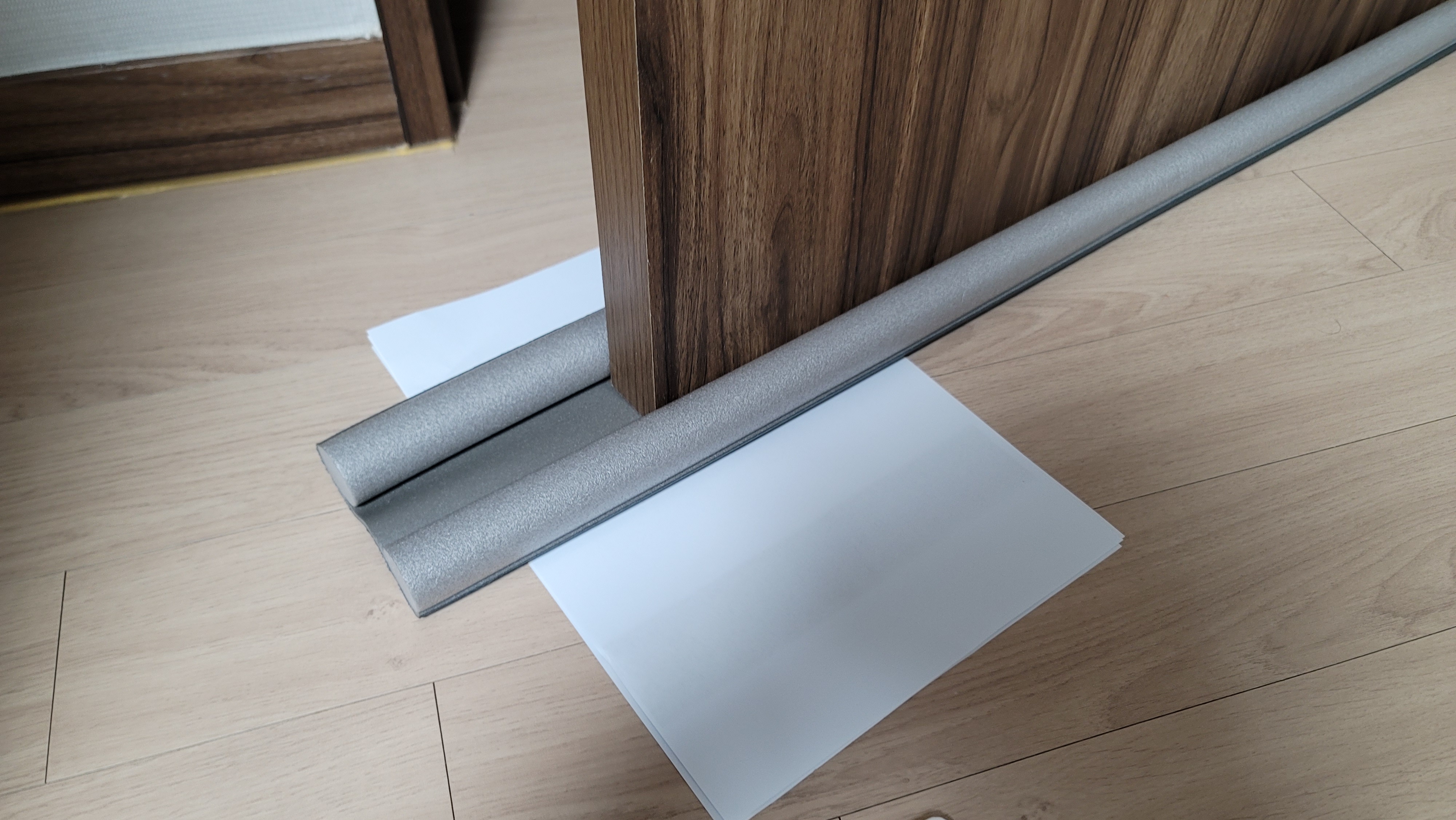 먼저 아래 사진처럼 방문을 열고 문 사이에 패드를 끼워 넣은 다음, 길이를 맞춰서 칼로 자라주면 설치가 완료됩니다.