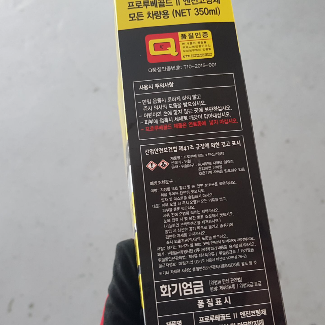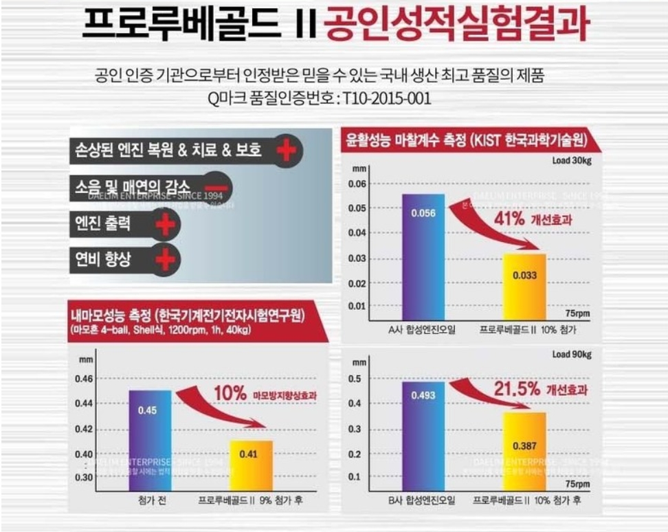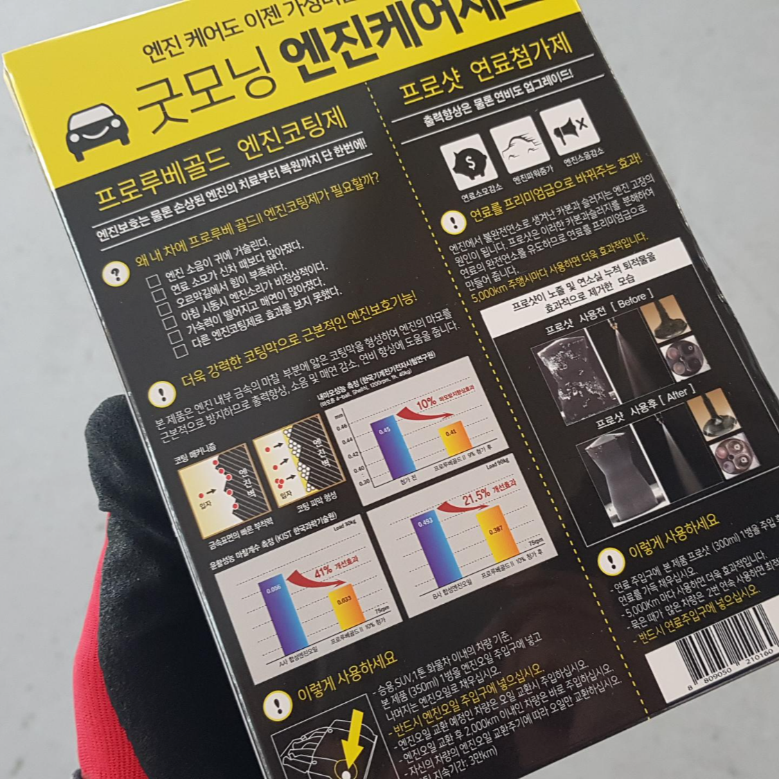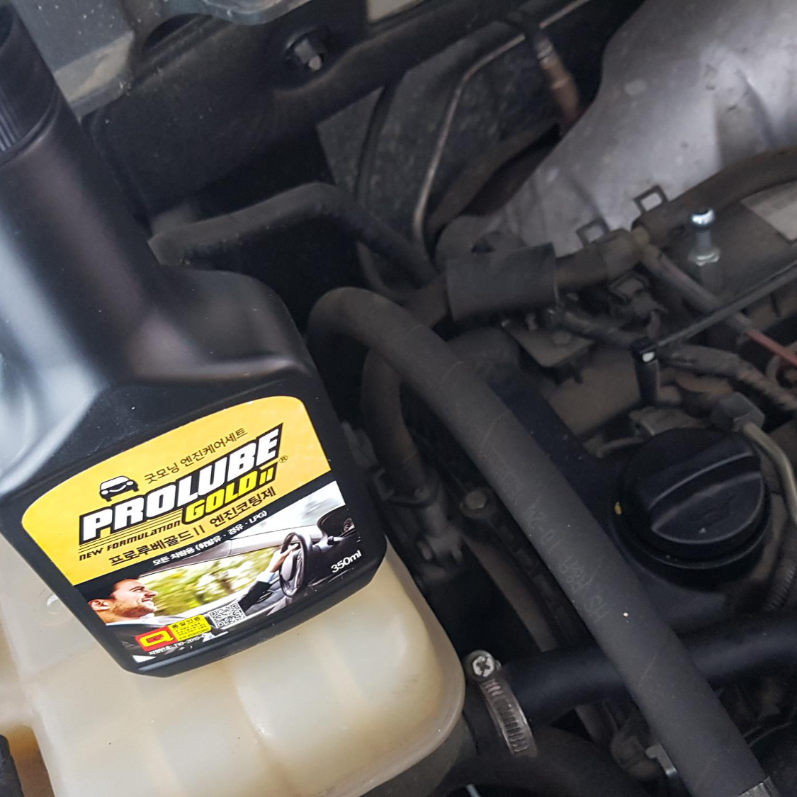 엔진오일 주입구를 돌려서 열어주시구요. 바로 프로루베 골드2를 넣어주시면 됩니다. 공인인증기관을 실험결과 윤활성능 마찰계수 측정결과 41% 개선되었고, 내마모성능 측정결과 10%가 향상되었다고 합니다.(한국과학기술원, 한국기계전기전자시험연구원) 가격이나 성능적인 부분에서 추천드리는 제품입니다.