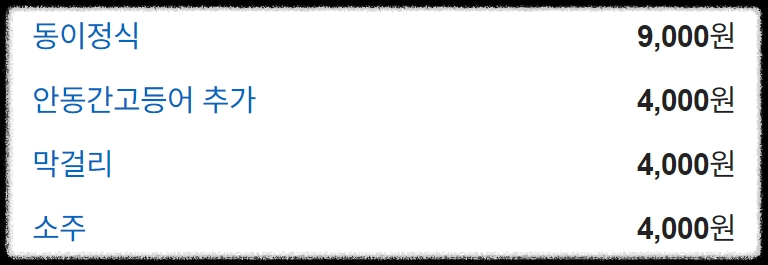 동이식당의 메뉴입니다. 단일 메뉴로 들어가서 자리를 잡고 앉으면 주문을 할 것도 없이 동이정식이 인원수대로 자동주문이 되고 음식이 나오기 시작합니다. 가격은 동이정식이 9,000원, 간고등어추가 4천원, 막걸리, 소주는 4,000원입니다.