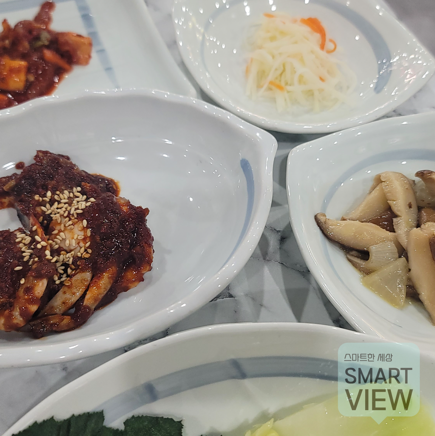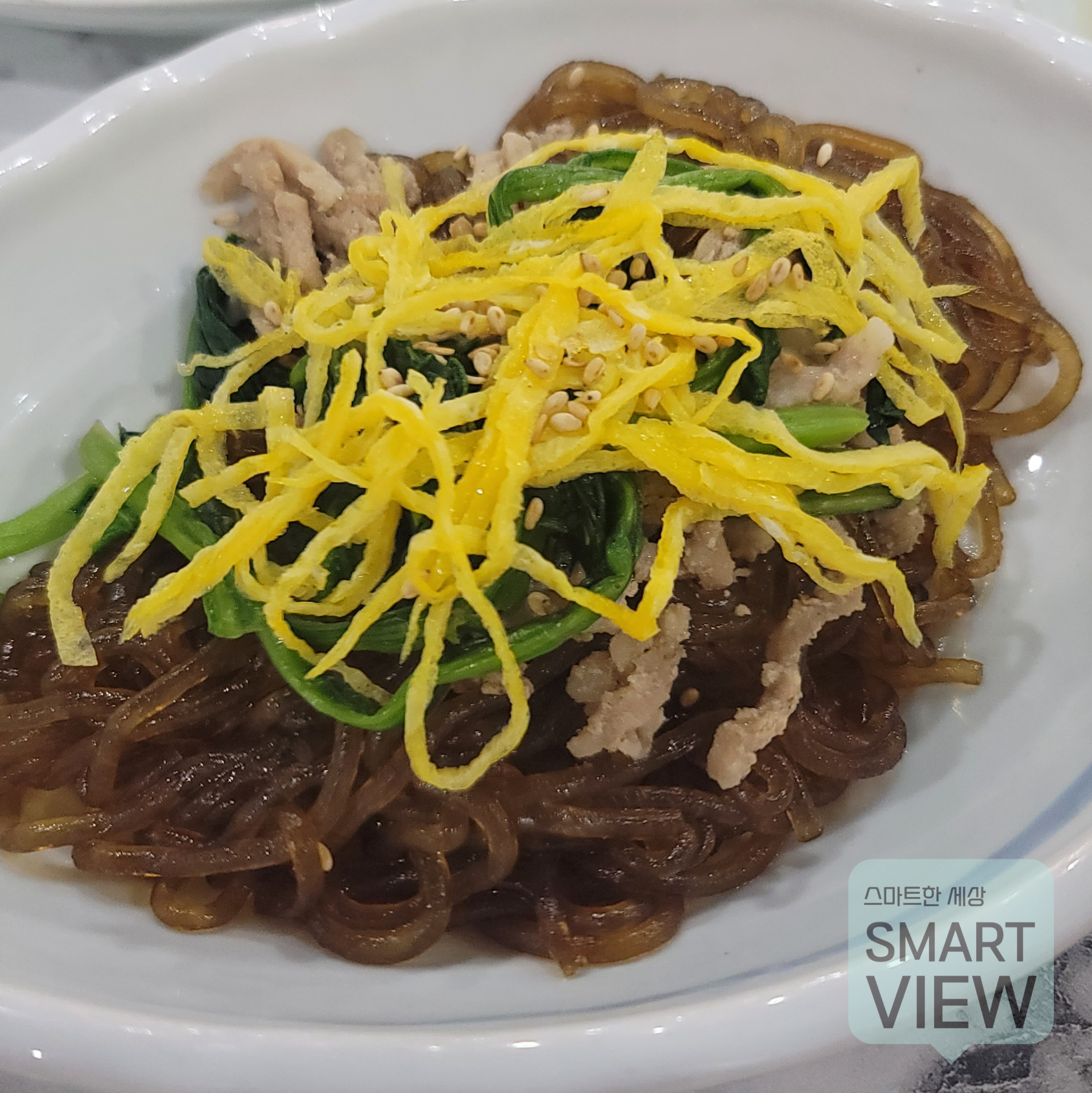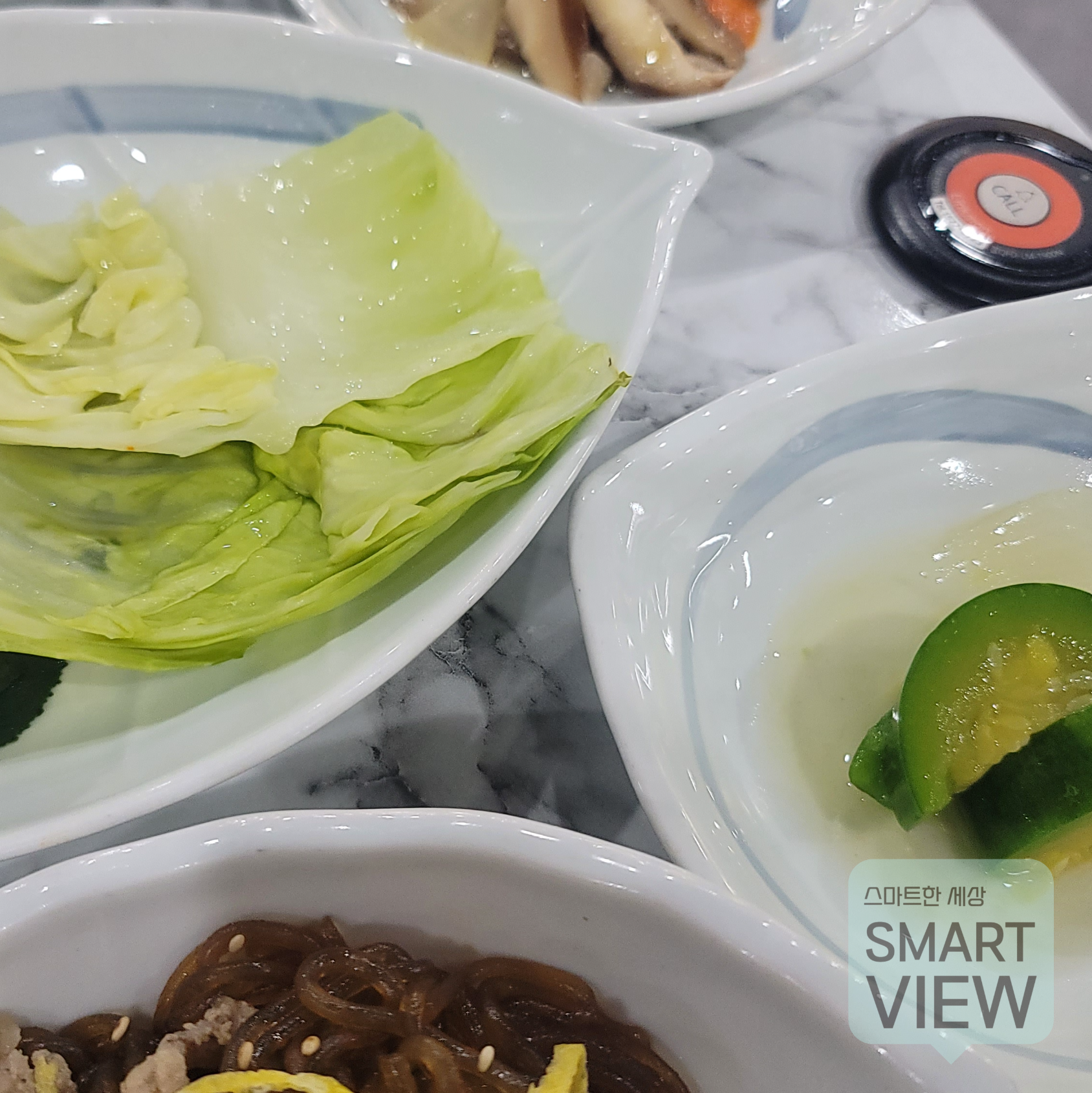 몇가지 반찬만 소개를 해보겠습니다. 제가 좋아하는 매콤한 양념게장, 찐 양배추, 호박볶음, 감자볶음, 잡채, 감자볶음에 이어