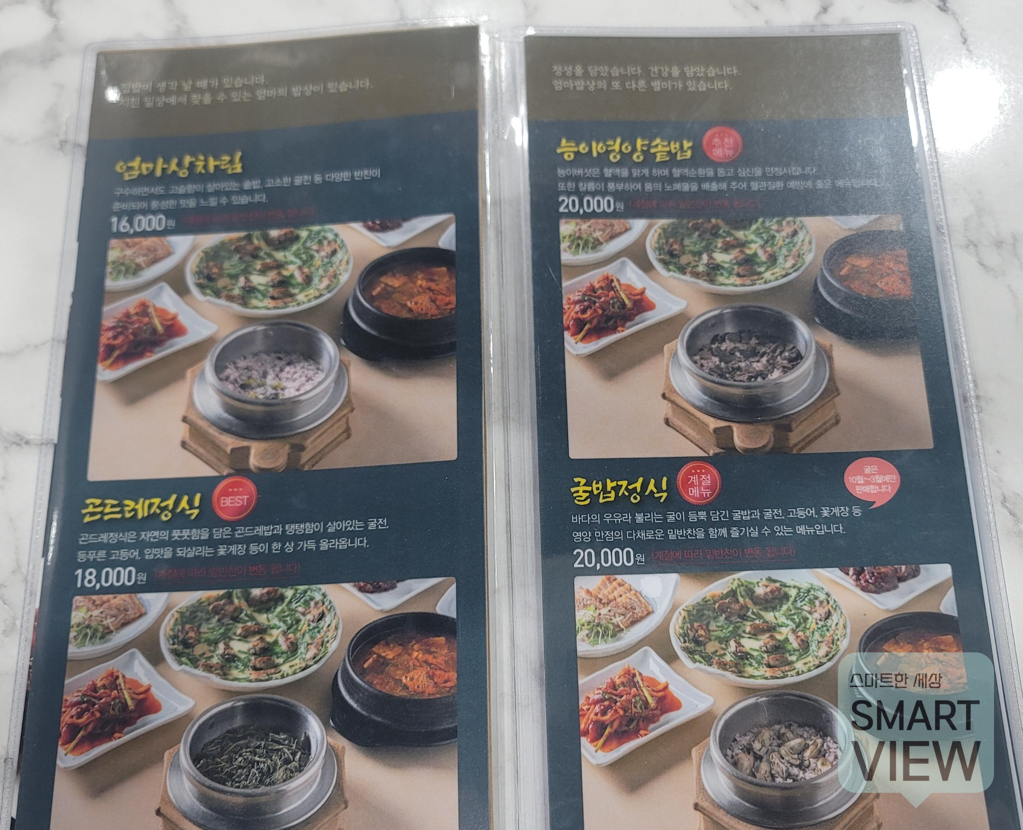 메뉴안내입니다. 대표메뉴라고 할 수 있는 엄마상차림이 16,000원, 곤드레정식이 18,000원, 능이영양솥밥이 2만원, 국밥정식이 2만원입니다. 엄마상차림은 일반 돌솥밥으로 나오고, 다른 메뉴는 돌솥밥에 각각의 이름에 맞는 재료가 추가되고, 반찬도 조금 추가가 되는 것 같더라구요.