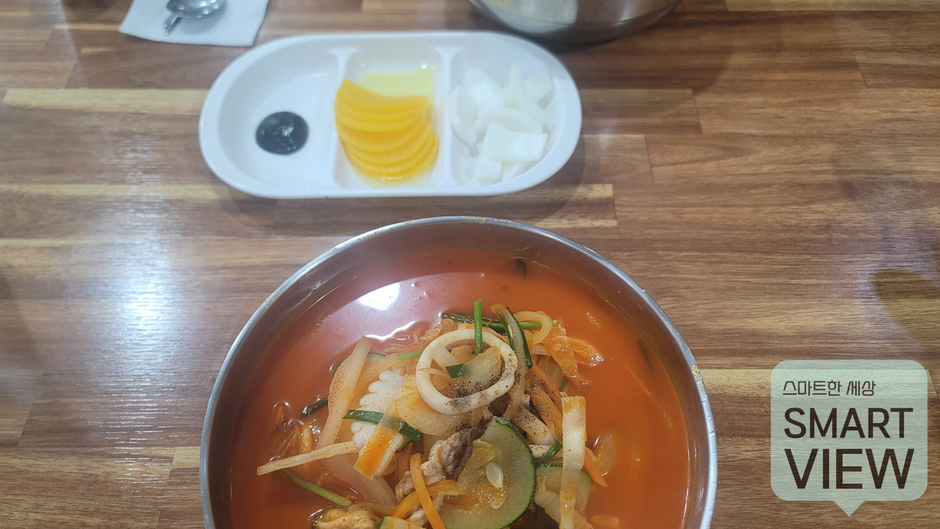 오래지 않아 나온 짬뽕~~ 고명으로 야채, 해산물, 고기 등이 올려져 있는데요. 홍합이 깐 채로 나와서 좋네요.. 어떤 식당에 가면 홍합이 열리지도 않고 상한 경우도 있고 그런데 말이죠..