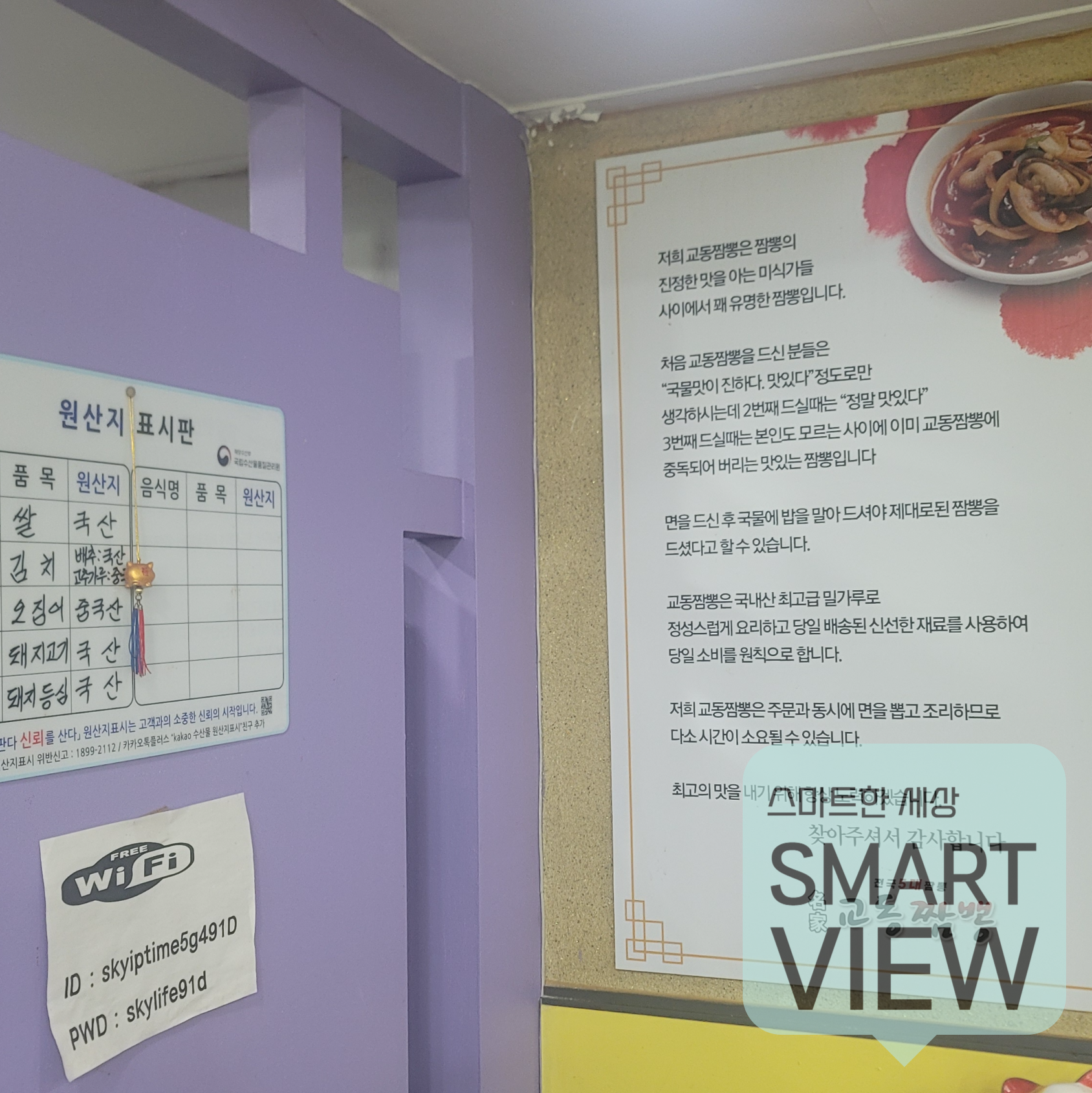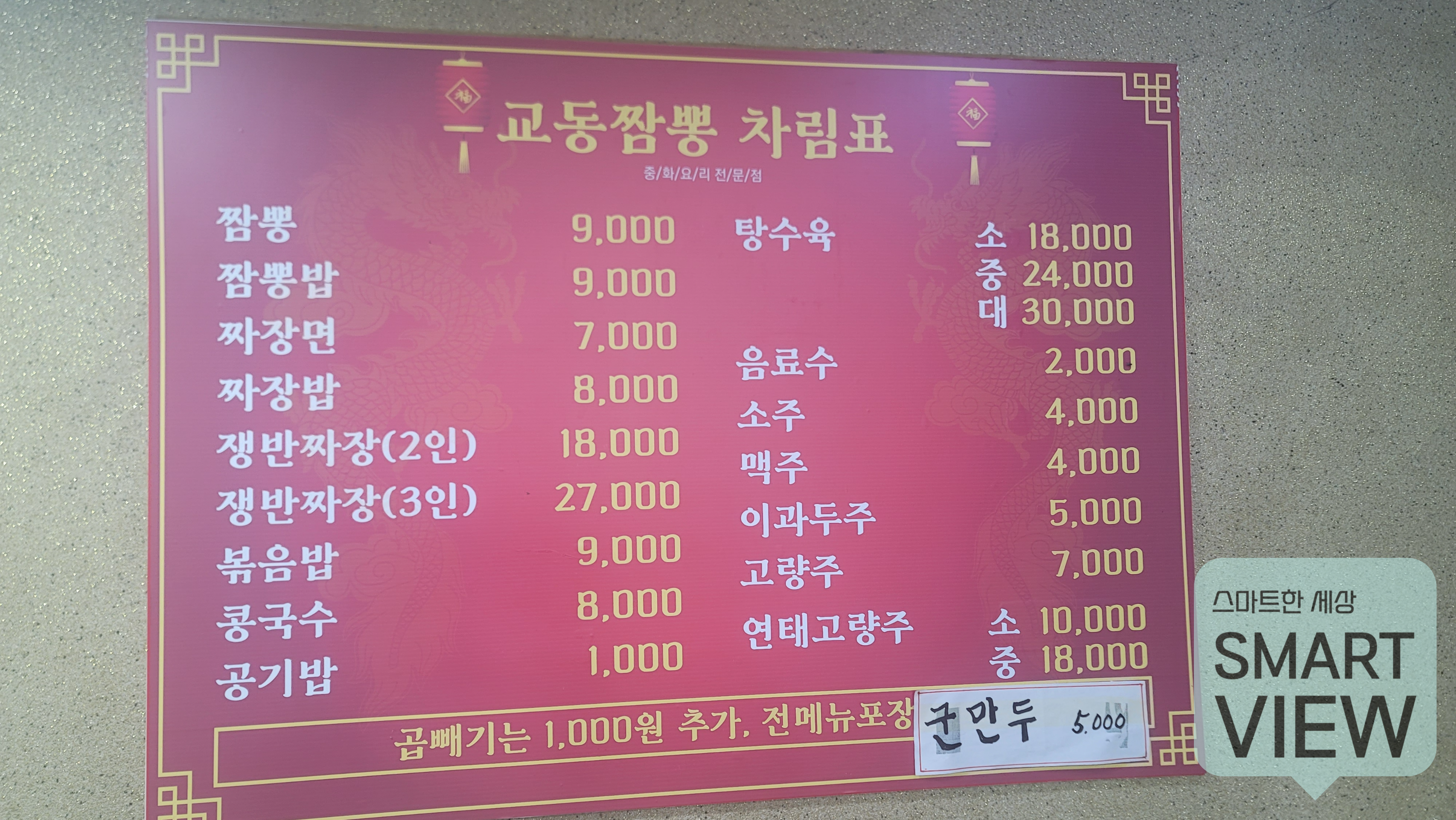 메뉴입니다. 짬뽕, 짬뽕맛이 9,000원, 짜장면 7,000원, 밥은 8,000원, 볶음밥 9,000원이구요. 다른 잡다한 메뉴없이 군만두, 탕수육이 끝입니다. 저희는 짬뽕 2개 주문이요.. 가격은 조금 비싼 수준이라고 할 수 있겠네요..