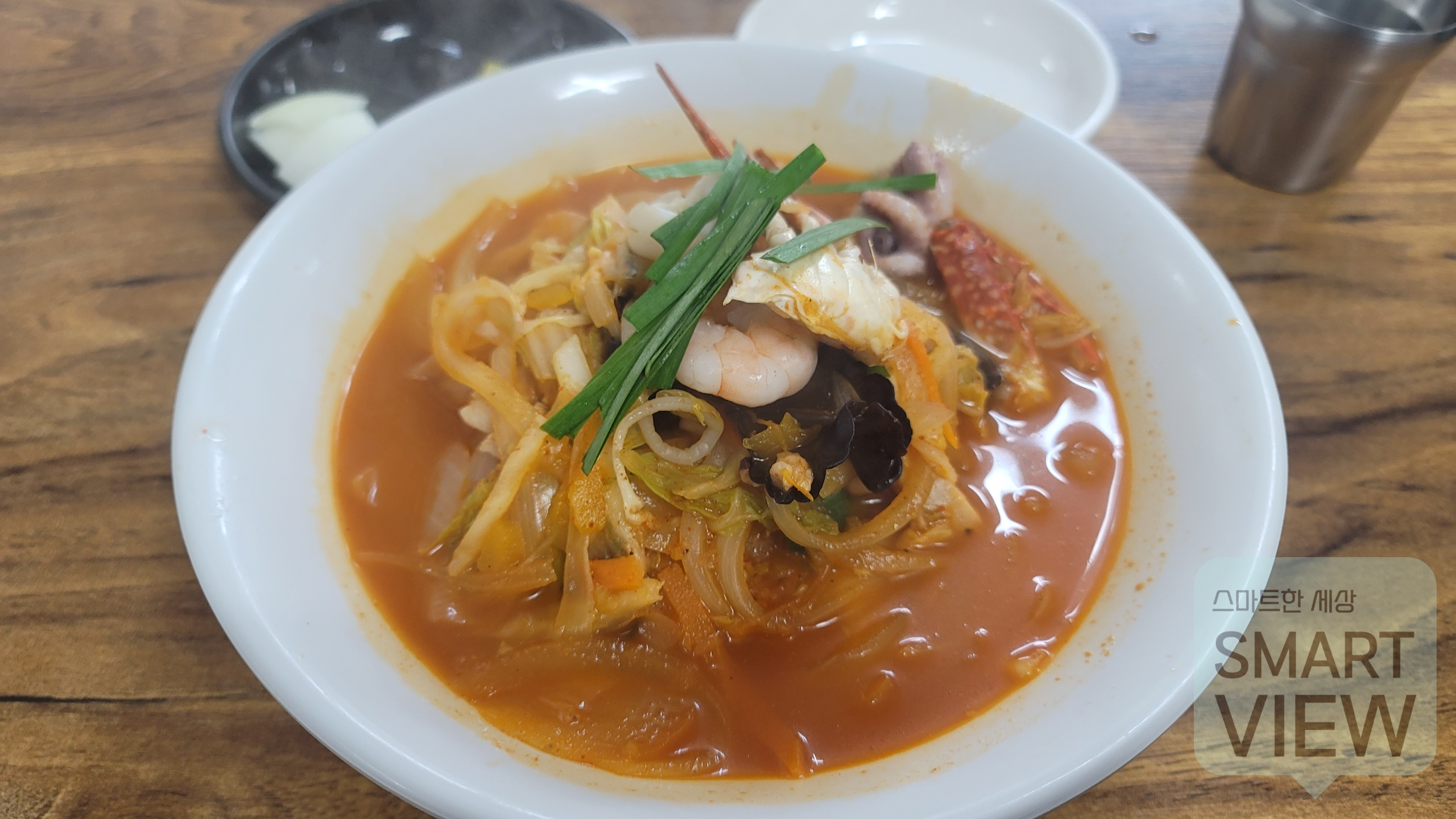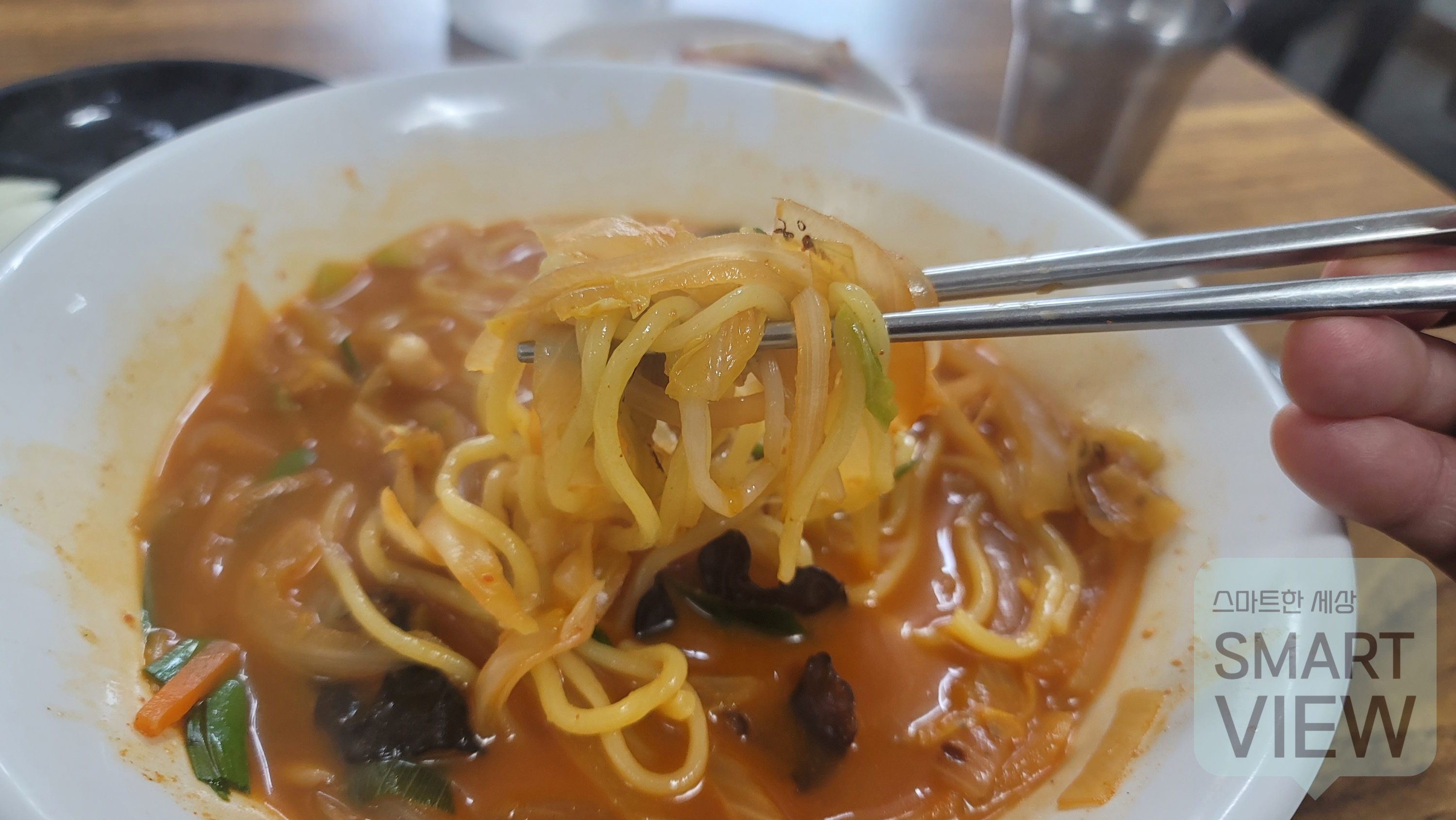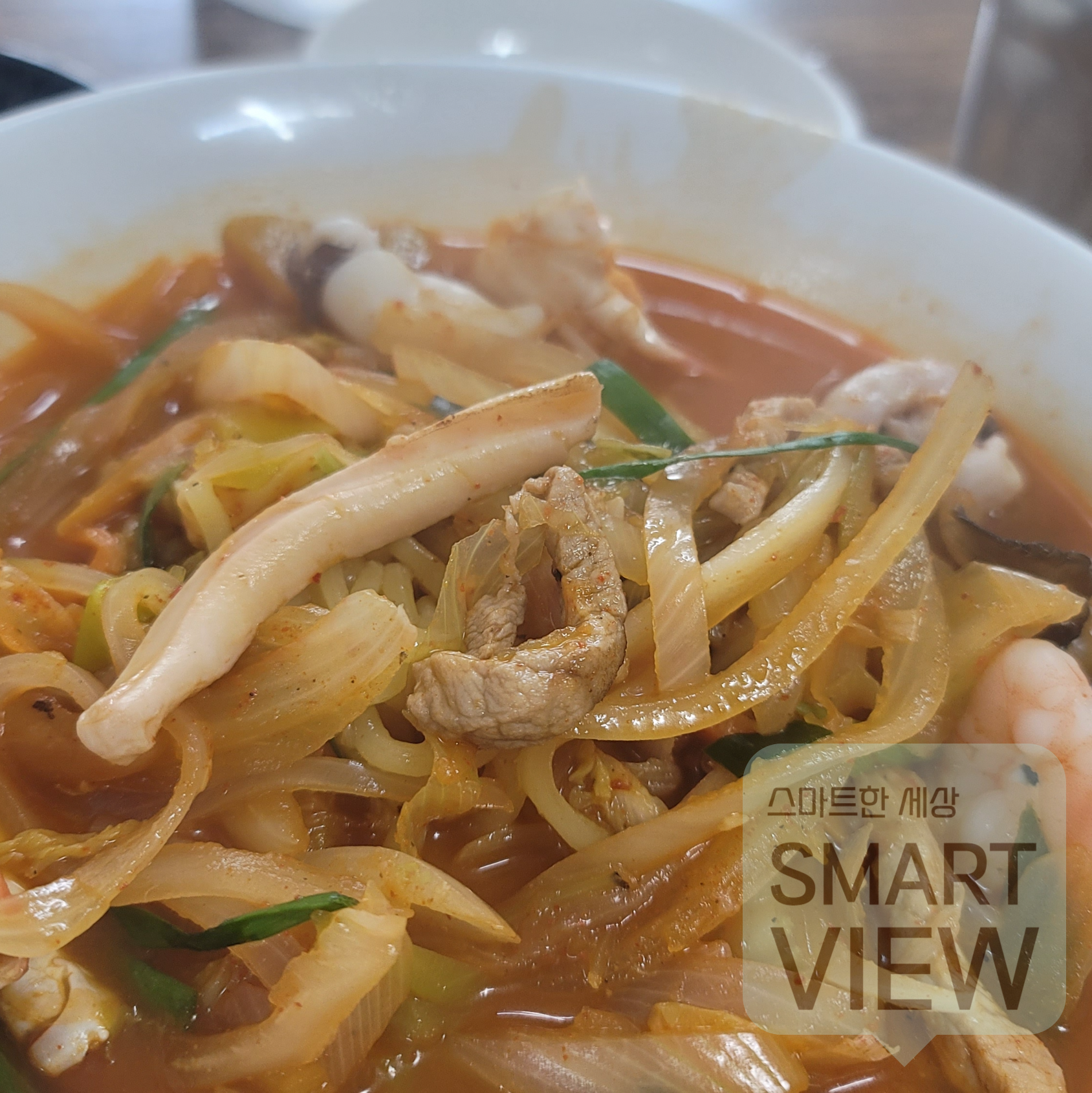 오징어는 물론이고, 홍합, 돼지고기, 양파, 부추, 목이버섯, 파 등등 갖은 재료들이 식감을 살려주고, 국물을 먹어보니 보통의 진하기에 칼칼한 매콤함이 전해지네요.