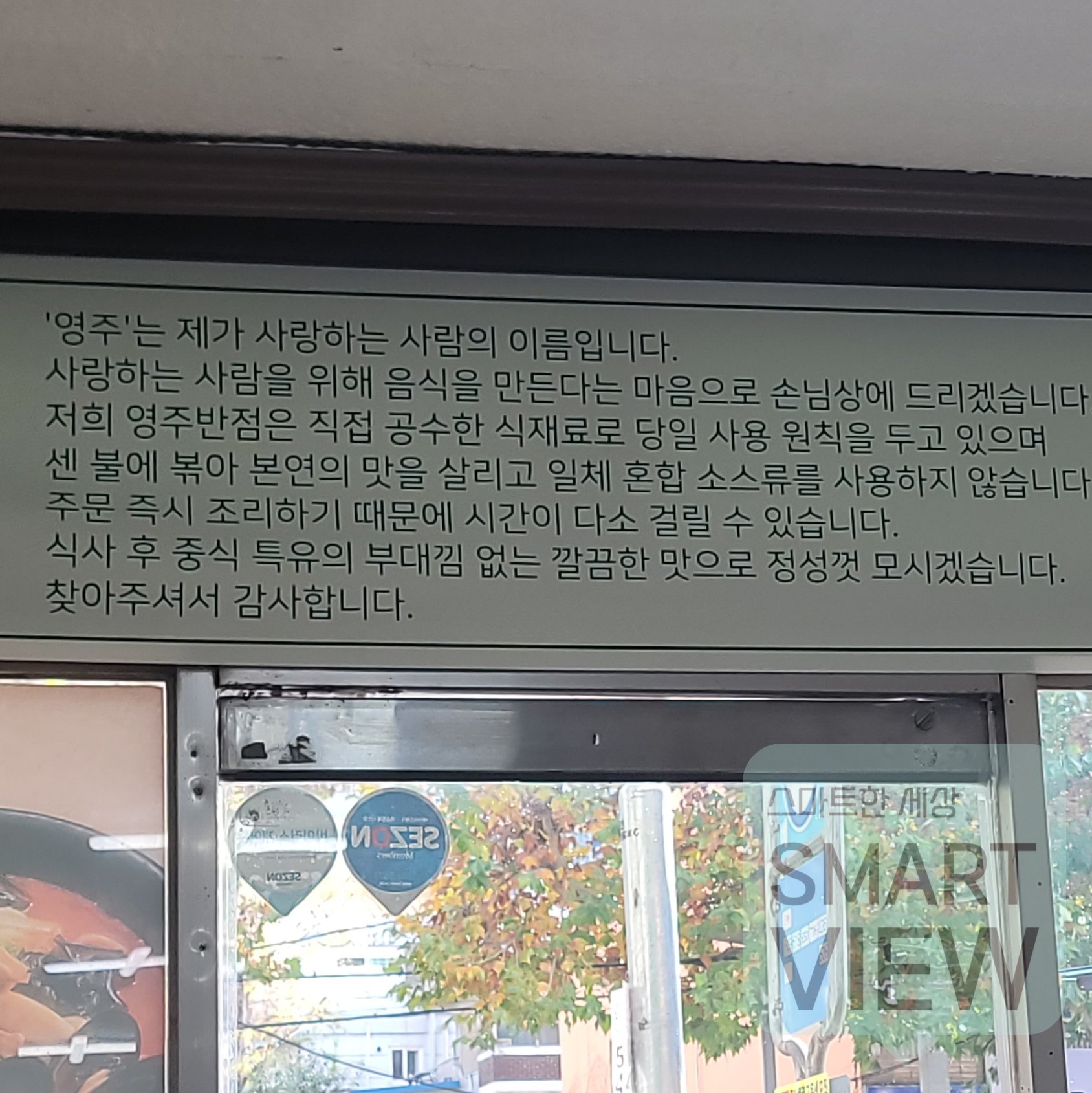 자리에 앉은 후 주위를 둘러보니 입구쪽에 영주반점에 대한 글이 있네요. 경상북도 영주시와는 관련이 없고, 사랑하는 사람의 이름이라고 하는데, 아내, 어머니, 따님의 이름이겠죠.. 영주반점은 식재료를 직접 공수해온다고 하구요. 주문 즉시 요리를 시작하기 때문에 시간이 조금 걸릴 수도 있다고 합니다.