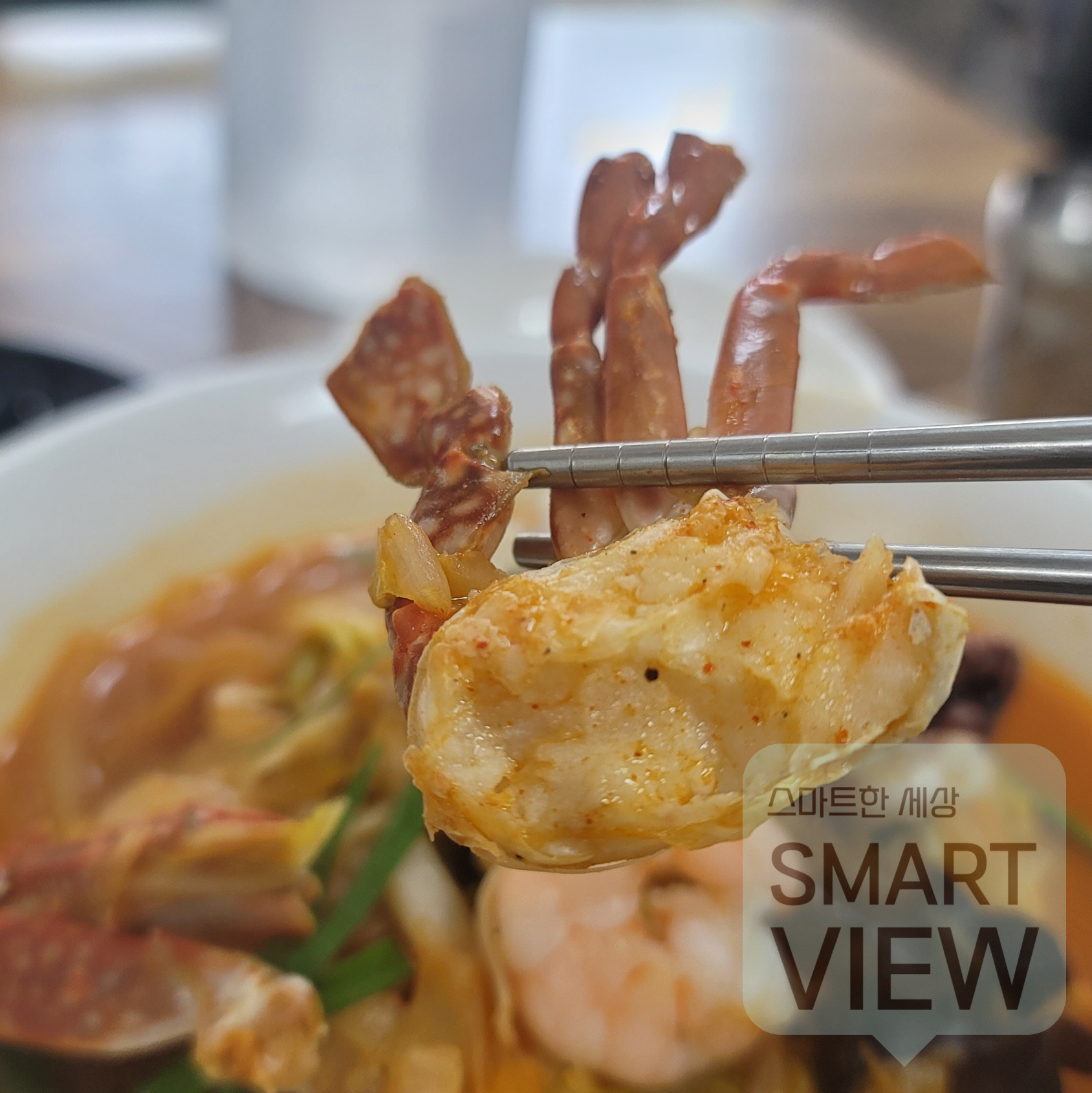 여기저기 숨어 있는 건더기를 한번 찾아봤는데요. 제가 좋아하는 주꾸미도 있고 새우랑 꽃게, 꼴두기 등등 다양한 해산물이 들어 있어요. 제가 다 좋아하는 해산물이라 기분이 좋아지네요.