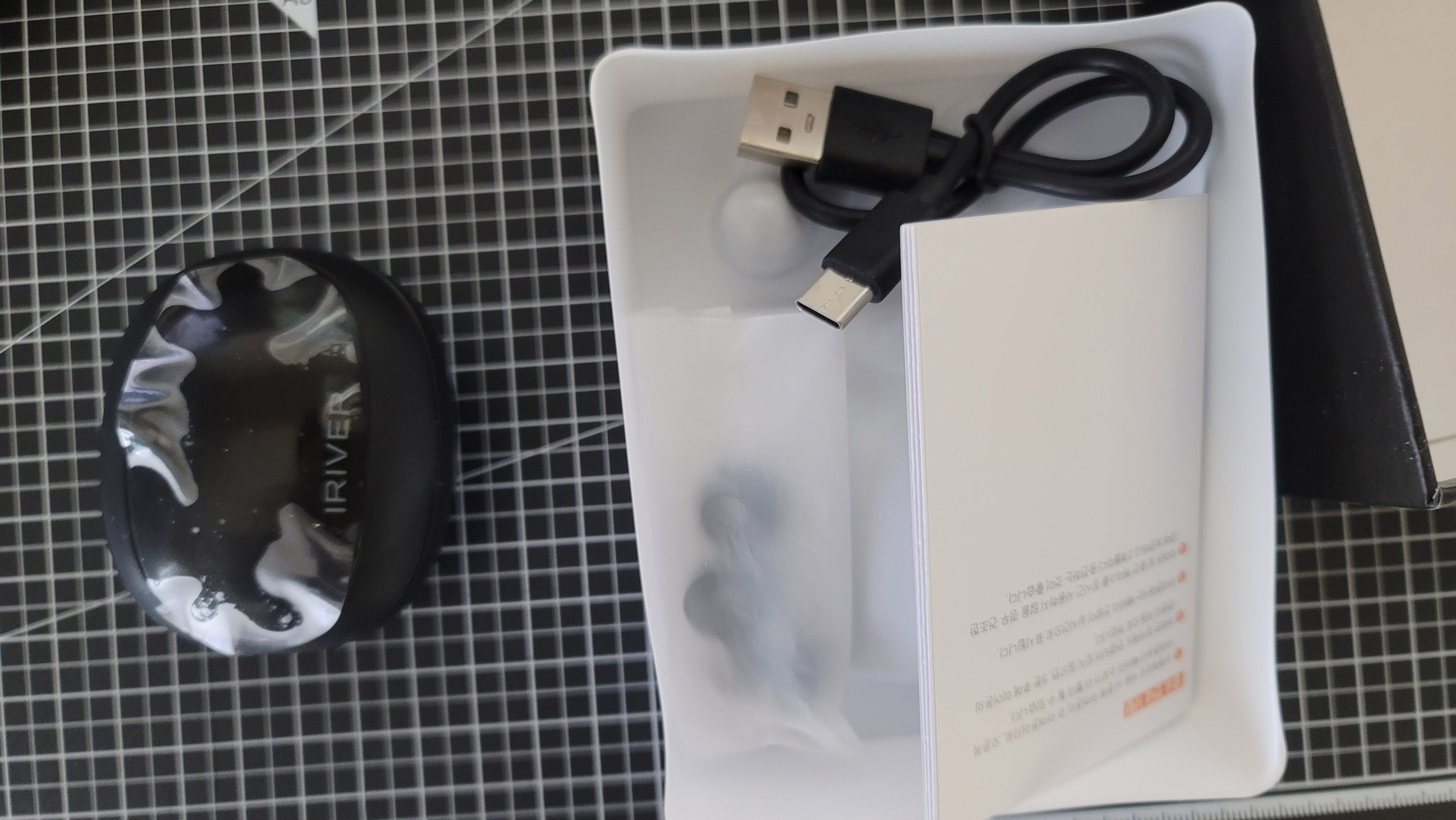 박스를 개봉하고 구성품을 살펴보겠습니다. 이어폰과 충전크래들, C타입 충전 케이블, 이어팁, 사용설명서 등입니다. 충전크래들은 보관용을 겸하는 크래들이라고 할 수 있습니다.