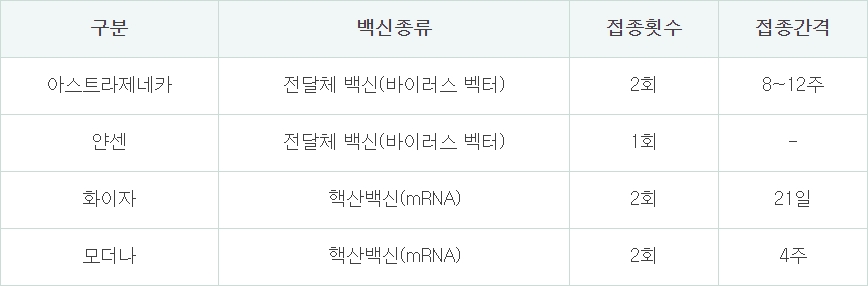 현재 국내에서 접종이 되고 있는 백신은 아스트라제네카, 얀센, 화이자, 모더나이구요. 최근에 노바백스 백신도 사용승인이 된 것으로 전해지고 있습니다. 아스트라제네카와 얀센은 바이러스 백터 계약이고, 화이자와 모더나는 mRNA계열입니다. 백신마다 접종횟수 및 접종간격이 다르므로 살펴보시기 바랍니다.