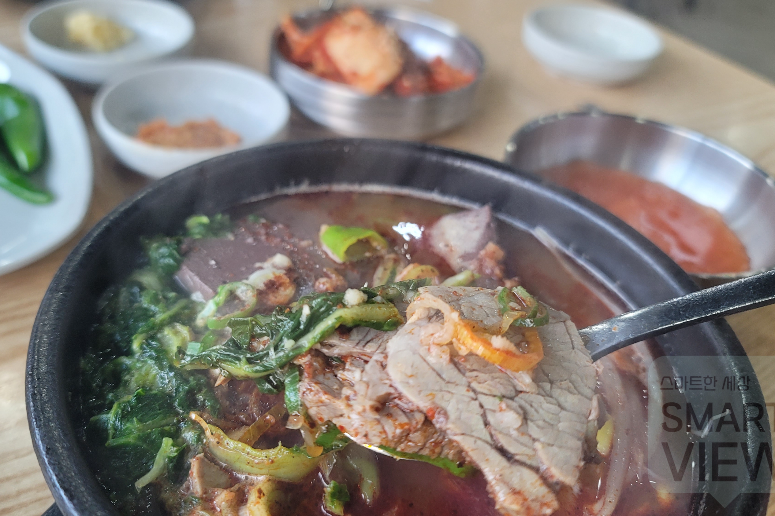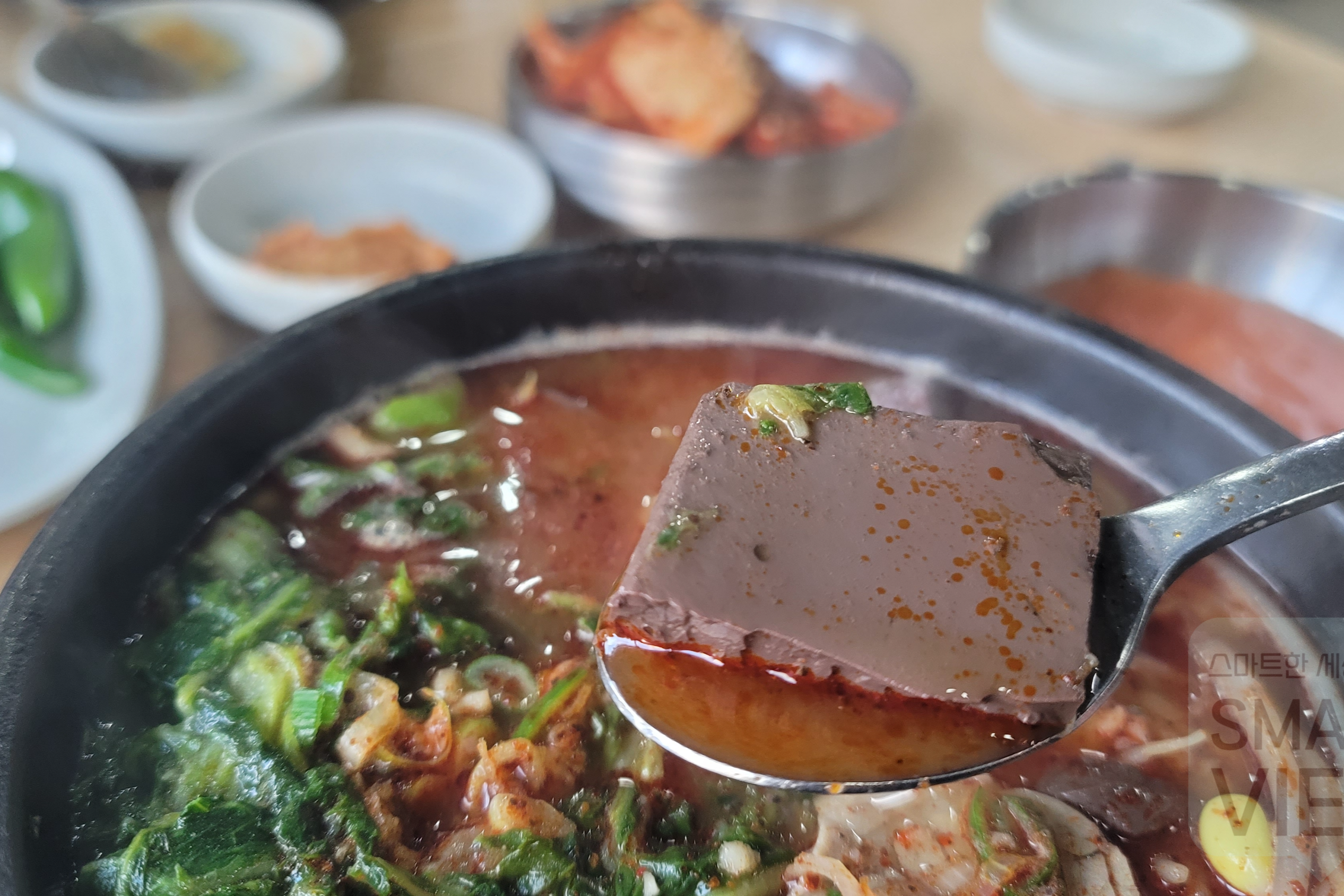 해장국에는 각종 야채와 소고기, 그리고 선지가 듬뿍 들어 있는데요. 밥을 말지 않아도 건더기로 국밥에 가득 차 있다고 보시면 되겠네요.