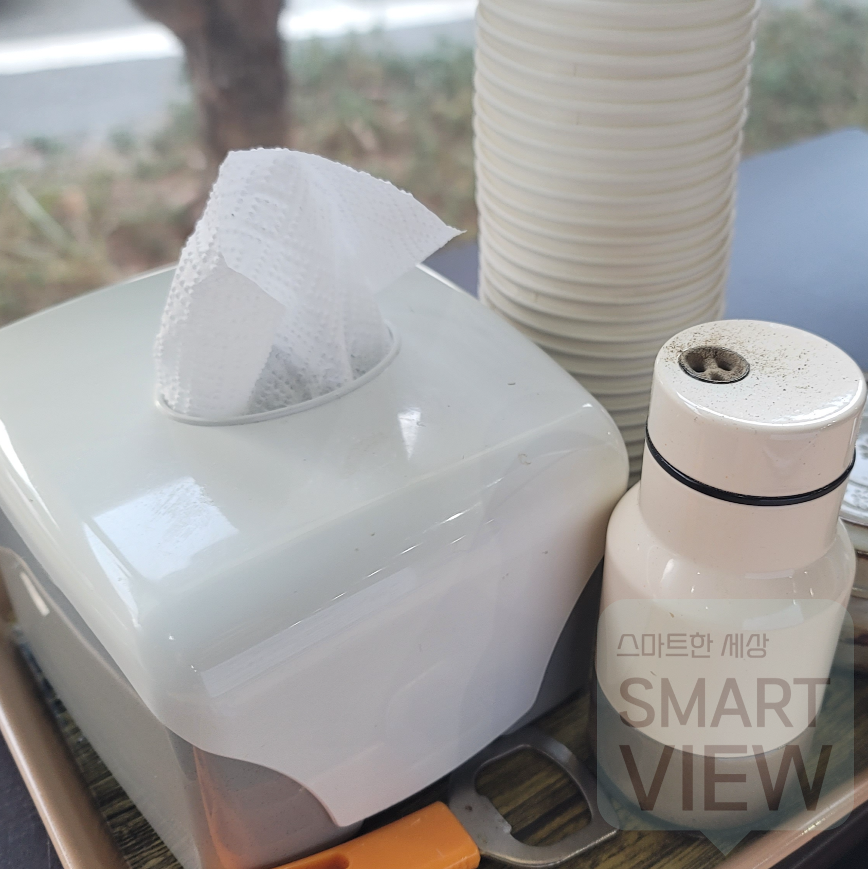 자리를 잡고 보니 네이버검색창에 N리뷰를 작성하시면 음료수를 하나 주니 이벤트를 하고 있군요.. 한번 해볼까 하다가 귀찮아서 패쓰~~ 테이블에는 국밥과 잘 어울리는 후추, 티슈, 종이컵이 준비되어 있습니다.
