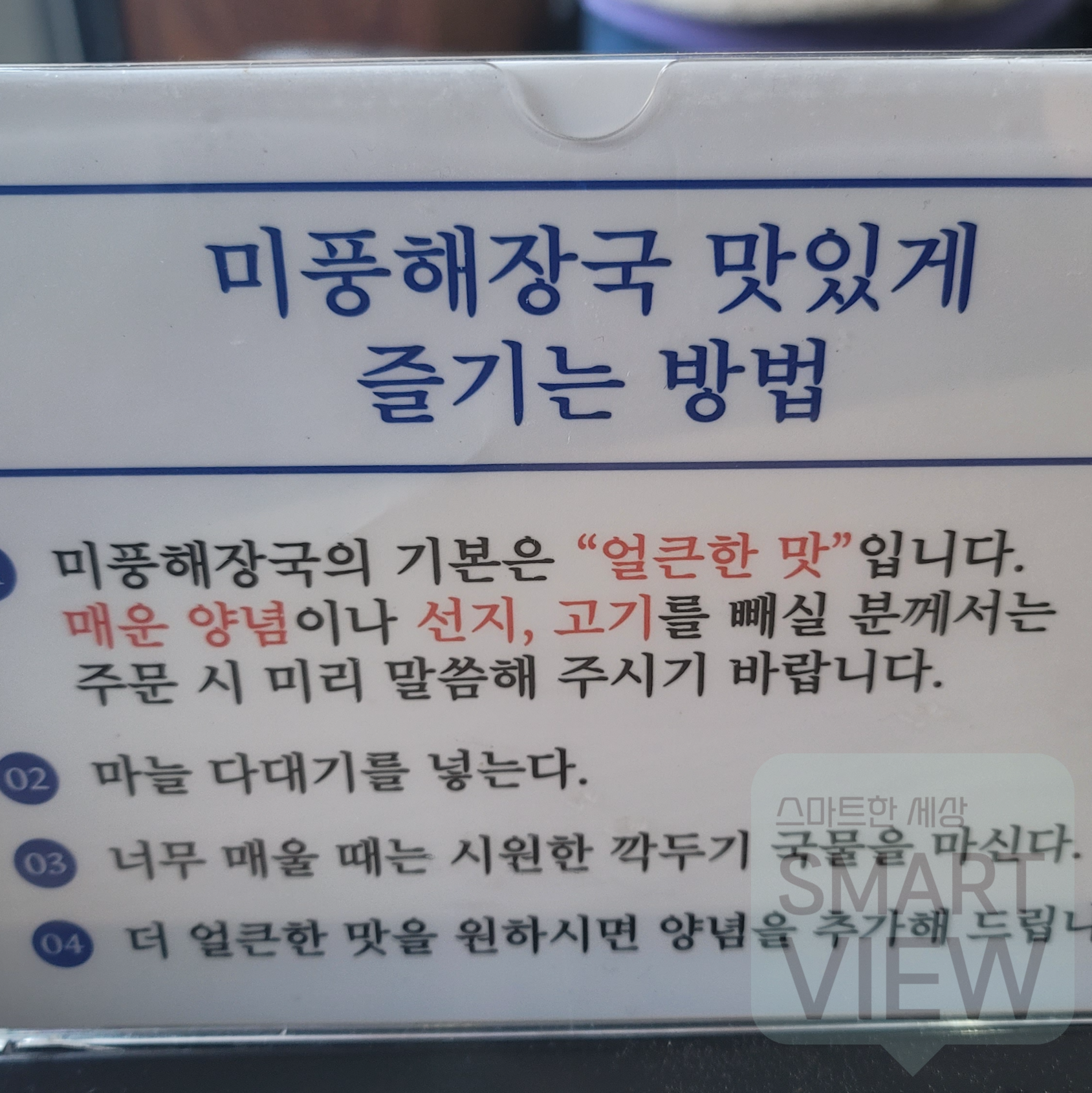 식당 앞 전용주차장에 주차를 하고 실내로 들어서니 일요일 아침에 해장하러 오신 분들이 제법 있으시더라구요. 안쪽에 자리를 잡고 메뉴판을 확인해 봤어요.