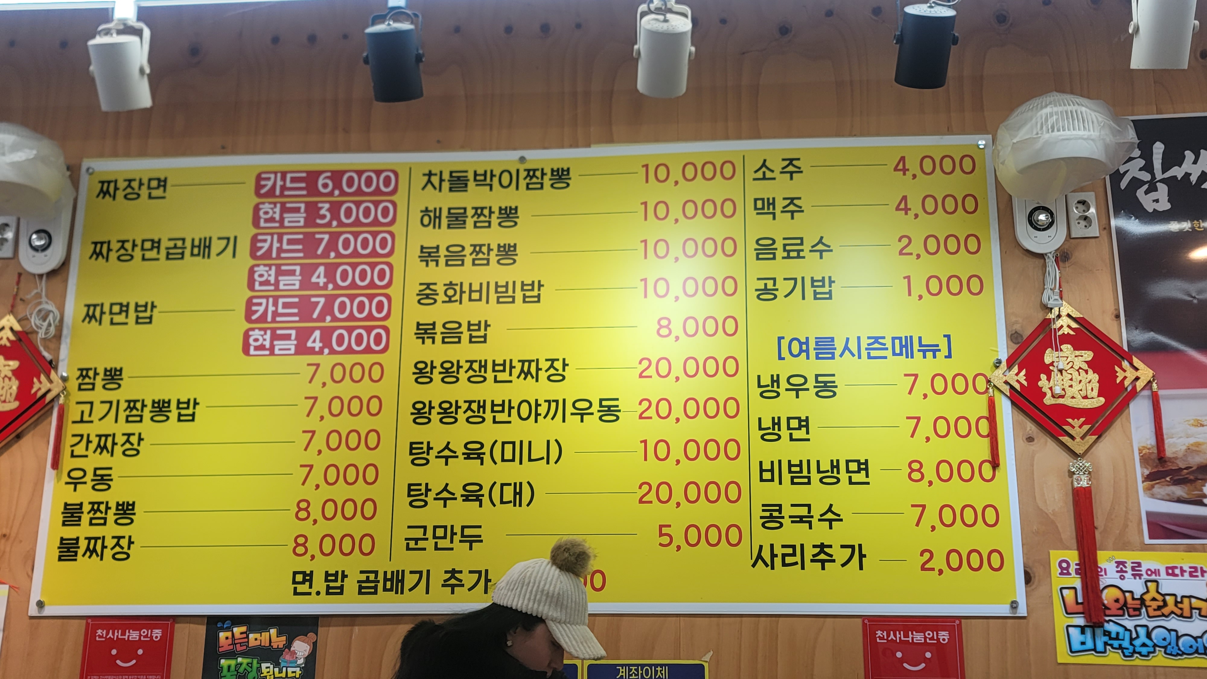 메뉴인데요. 식사를 하면서 들어오시는 손님의 80% 이상이 드시는 짜장면 가격이 단돈 3,000원 곱배기 천원 추가~~ 현금가구요. 카드 내시면 바로 곱하기 2 됩니다.^^ 다른 면류는 짜장면에 비해서는 가격이 좀 있는 편이지만, 그래도 평균보다 저렴한 가격이라고 생각이 됩니다. 짬뽕과 간짜장, 우동이 7,000원, 불 들어가면 천원 더 올라가구요. 미니 탕수육이 1만원 등 착한 가격이죠..