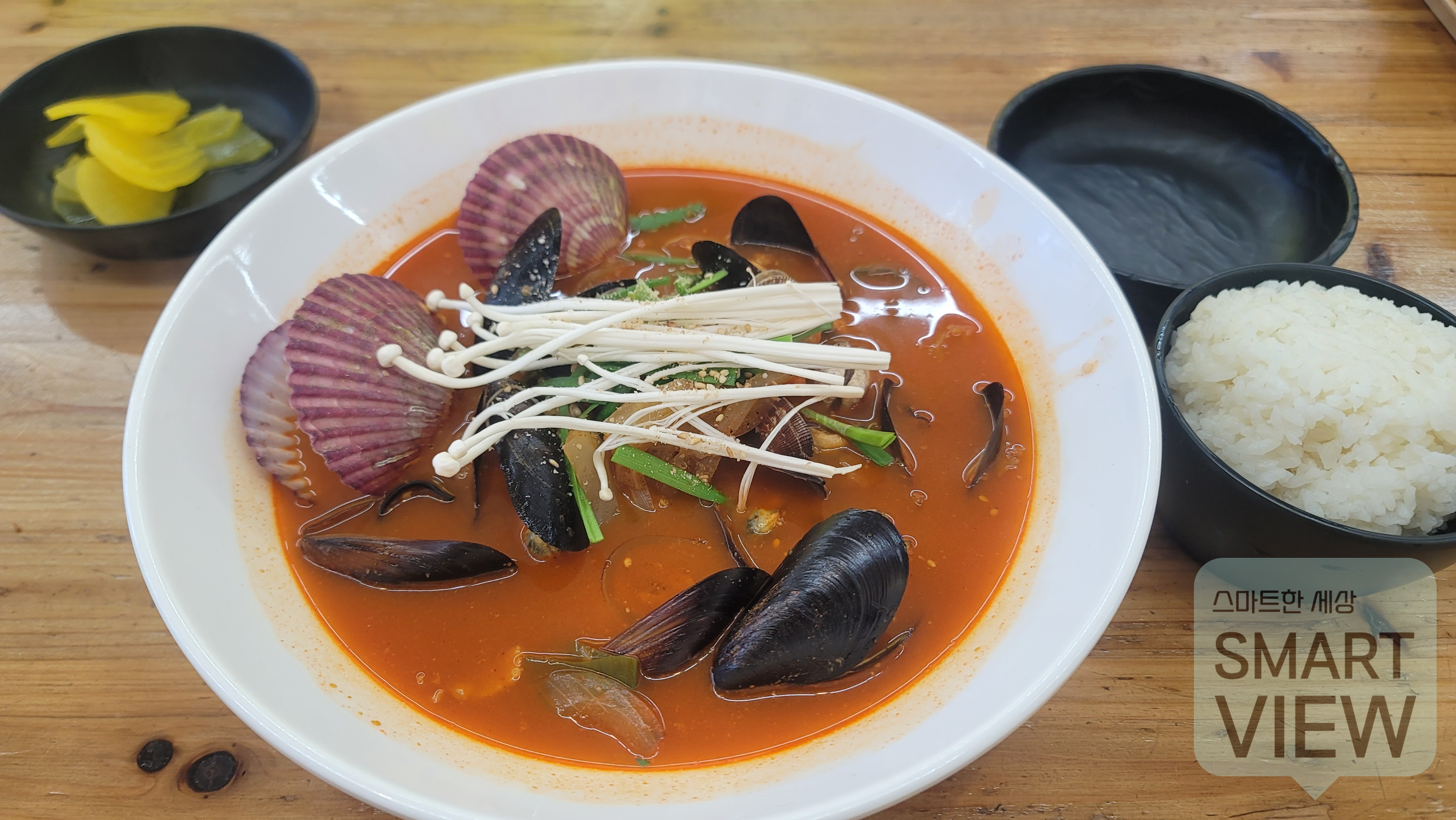 다음은 7,000원짜리 고기짬뽕밥... 양 대단합니다. 건더기랑 국물이 많아서 밥을 다 먹으면 성인 남자가 다 먹기 힘들 정도로 나오더라구요. 가라비, 홍합, 바지락은 물론 고기짬뽕답게 돼지고기도 꽤 들어 있어서 7,000천원이라는 가격이 완전 착해지는 짬뽕밥이죠.
