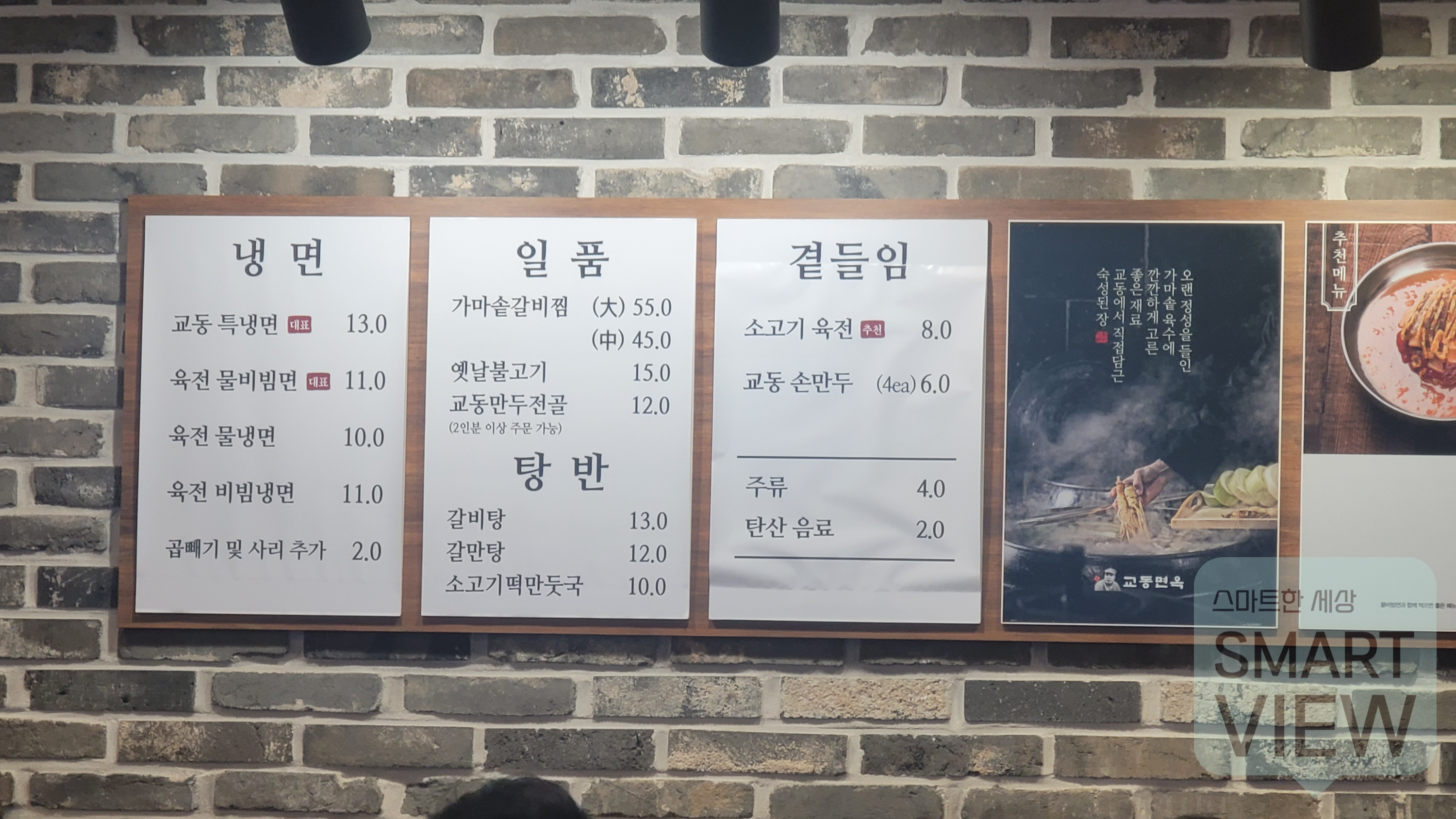 실내는 홀에 의자식으로 되어 있고, 전체적으로 깔끔하게 잘 정리가 된 식당입니다. 이 장소에서 장사를 한 식당들이 자주 바꿨는데, 교동면옥이 들어온 이후에 바뀌지 않고 오래 동안 장사를 하시네요.