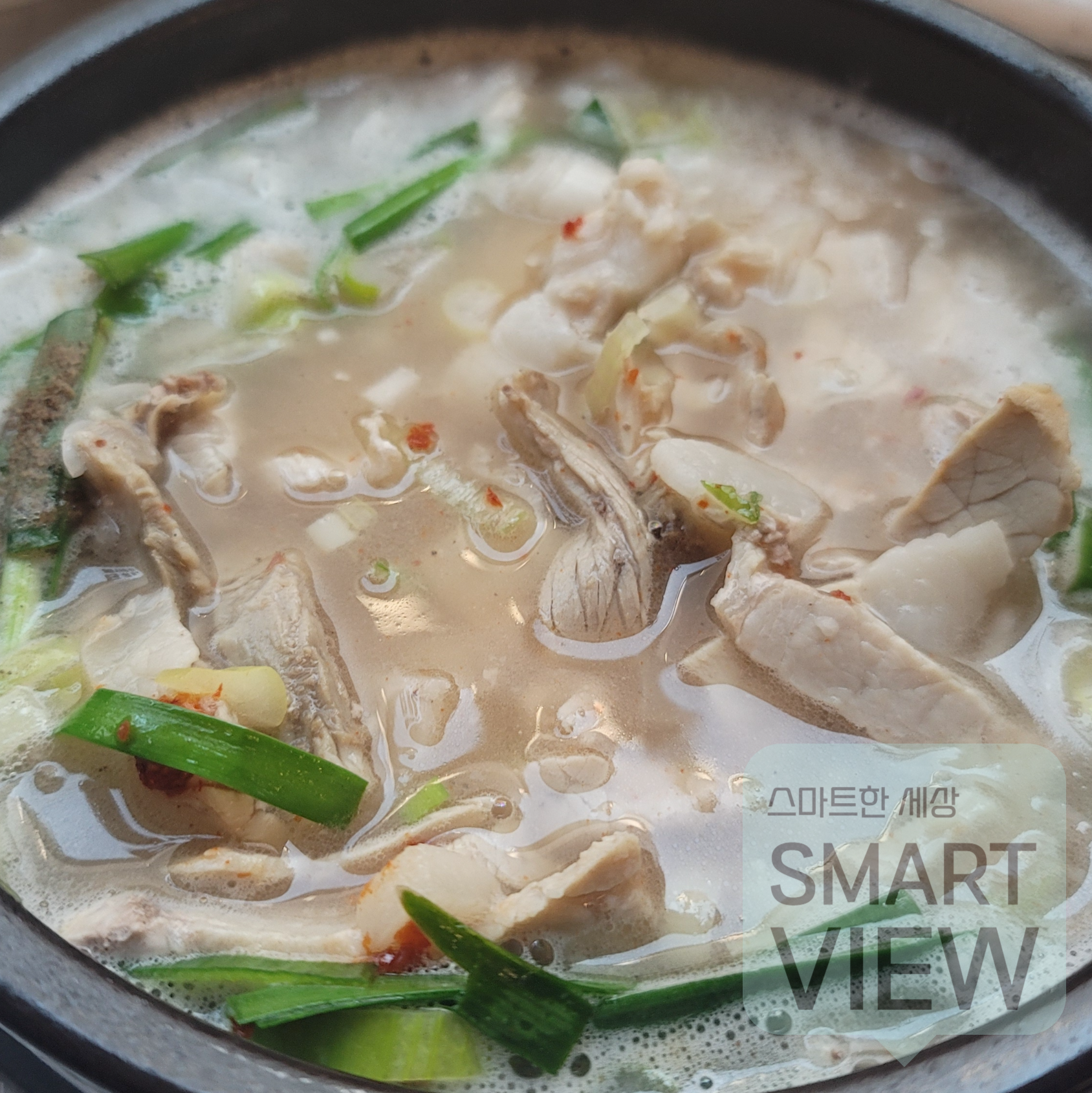 주문한지 오래지 않아서 나온 순대국밥, 고기정식을 먹을까 순대국밥을 먹을까 고민을 많이 했는데, 고기랑 순대랑 같이 먹을 수 있는 순대국밥으로 선택했답니다. 국밥 위체는 부추랑 파가 고명으로 올려져 있어요.
