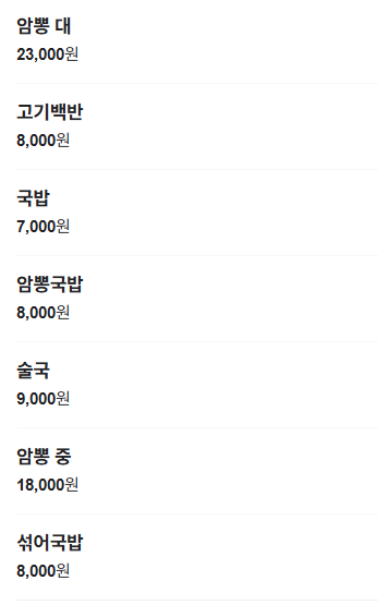 100번집의 메뉴~~ 국밥, 고기백반, 순대국밥, 암뽕국밥, 섞어국밥, 술국, 수육, 순대, 암뽕을 판매하고 있구요. 국밥 가격이 8,000원으로 저렴한 편이고, 다른 곳에서 1만원 가까이 하는 고기백반이 8,000원, 오늘 주문한 순대국밥이 8,000원으로 착한 가격의 식당입니다. 갈비수육은 2시간 전에 예약을 하셔야 드실 수 있습니다.
